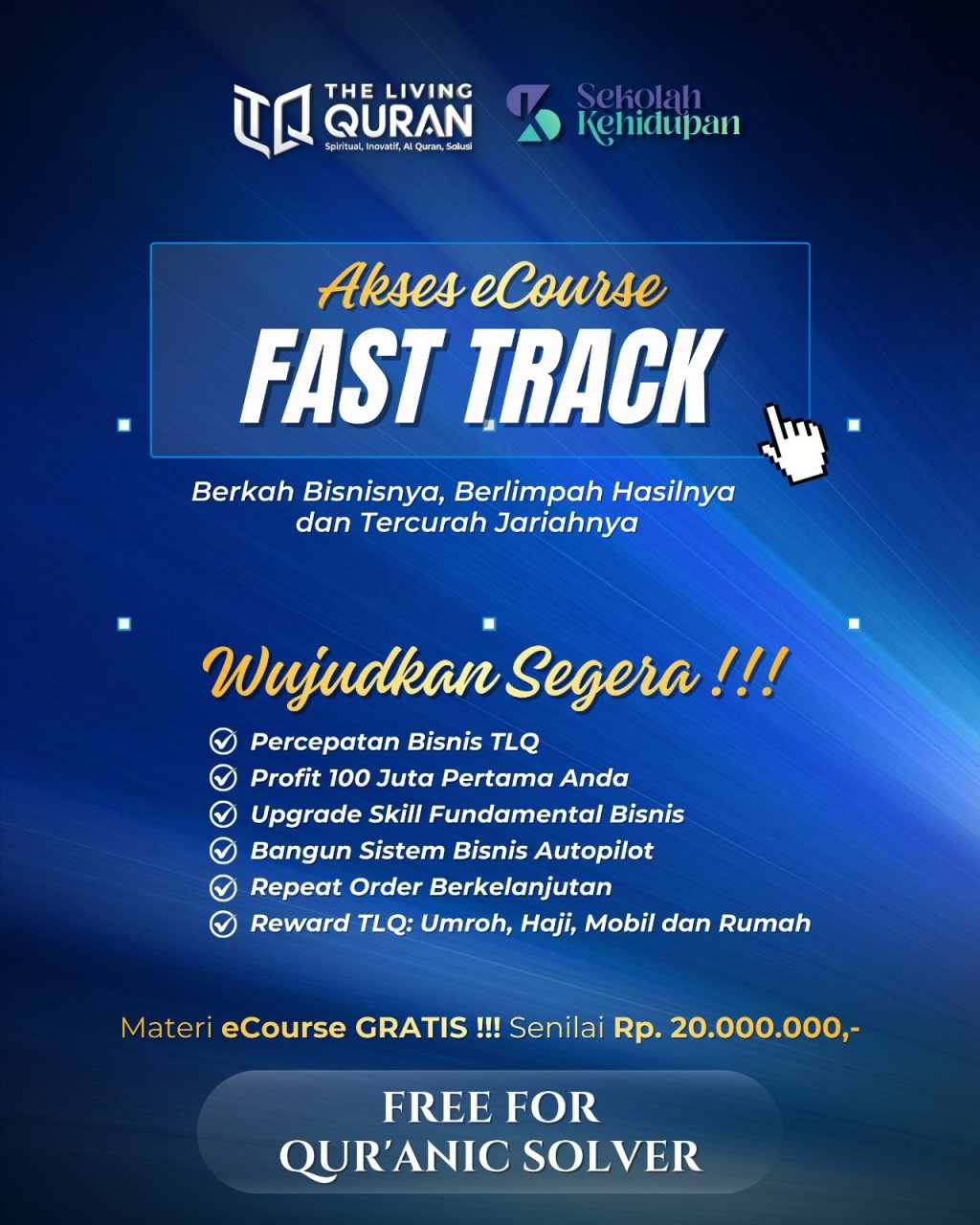 FastTrack 2.0 adalah program percepatan yang diselenggarakan oleh TLQ Pusat untuk membantu para Quranic Solver membangun bisnis Qur’ani yang lebih matang secara sistem, kuat secara mental, dan kokoh secara kepemimpinan, dengan tetap menjadikan Al-Qur’an sebagai pusat keputusan hidup dan bisnis.