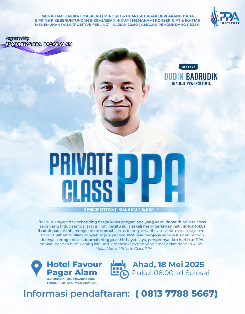 PPA di sajikan dalam ‘One Day Training Private Class’ yang Membahas POLA Terapan Aplikatif untuk Menyelesaikan problematika kehidupan telah dipraktekan oleh ribuan alumninya, Bukan Cuma teori tapi Aplikatif dan terbukti mampu mengundang keajaiban dalam hidupnya.