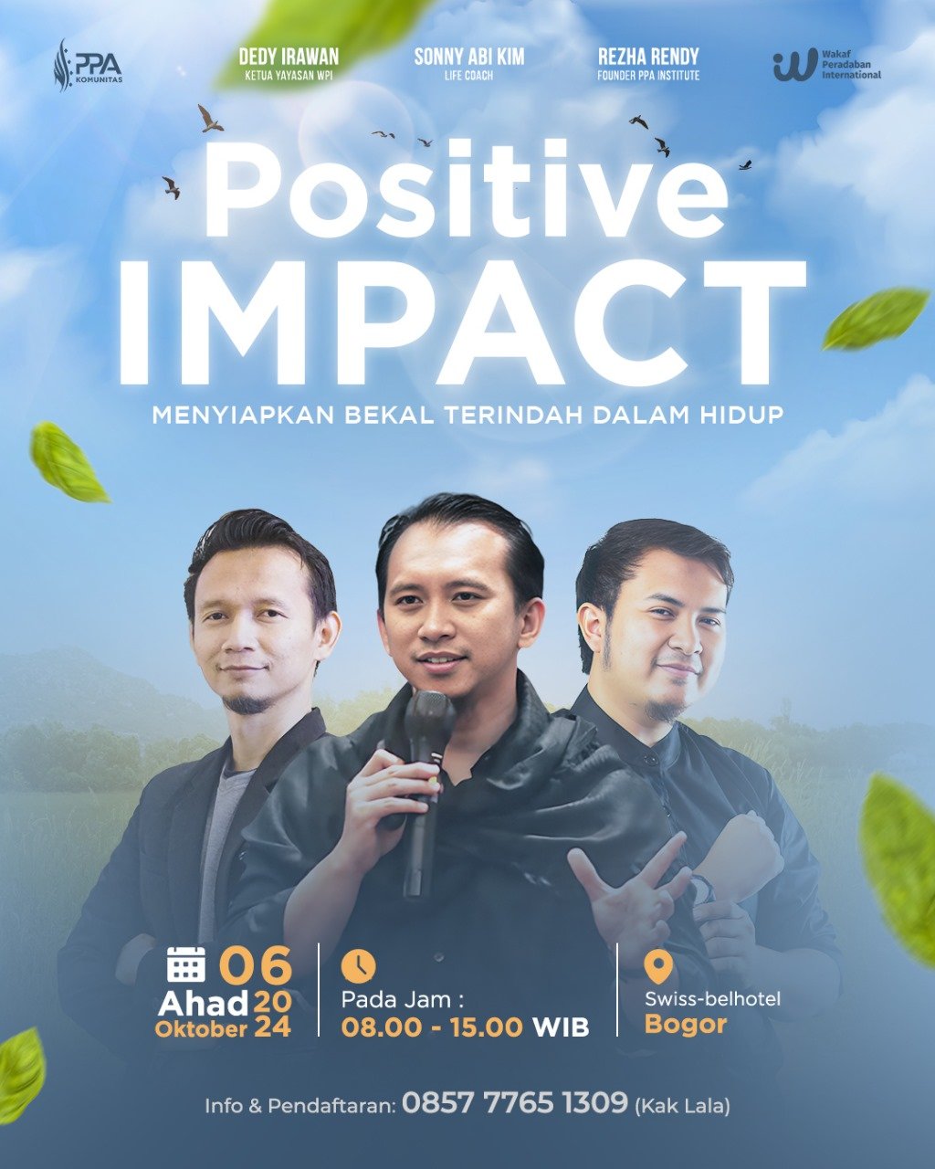Mari kita ikuti POSITIVE IMPACT yang akan memberikan energi bagi kita untuk menyiapkan bekal terindah dalam hidup kita, Sebuah Event offline terbaru dan spesial di bulan Oktober 2024 yang akan dibersamai oleh 3 guru sekaligus.